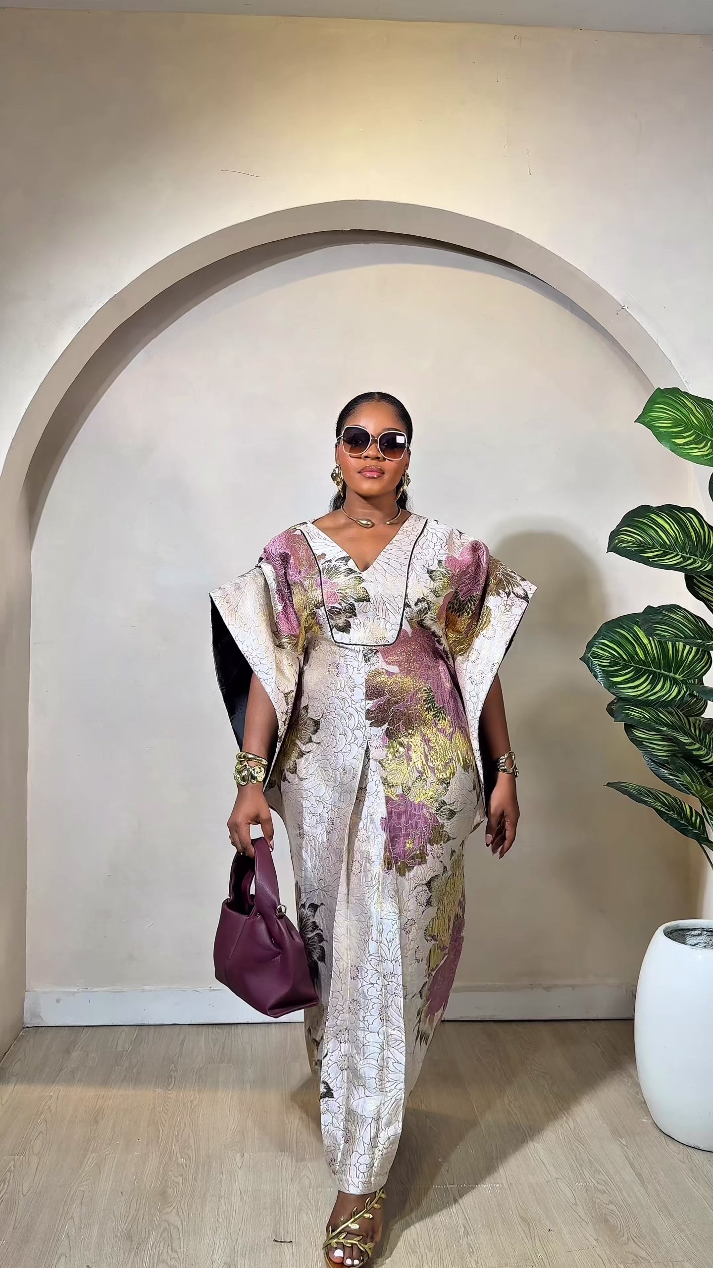 The brocade’s metallic sheen catches the light with every movement, showcasing intricate patterns in soft pink, gold, and lilac tones, creating a look that is both regal and modern. The relaxed silhouette drapes beautifully on the body, offering comfort without compromising sophistication.